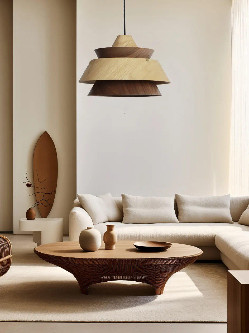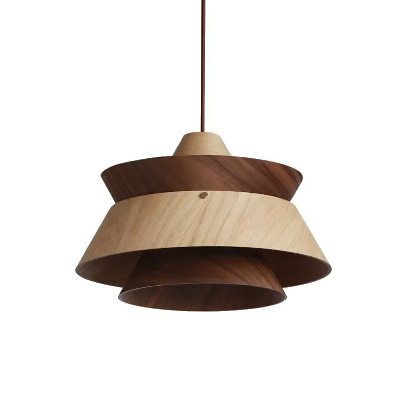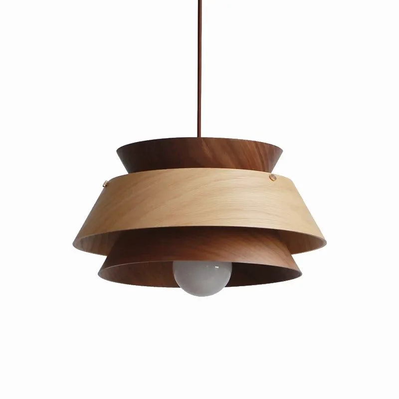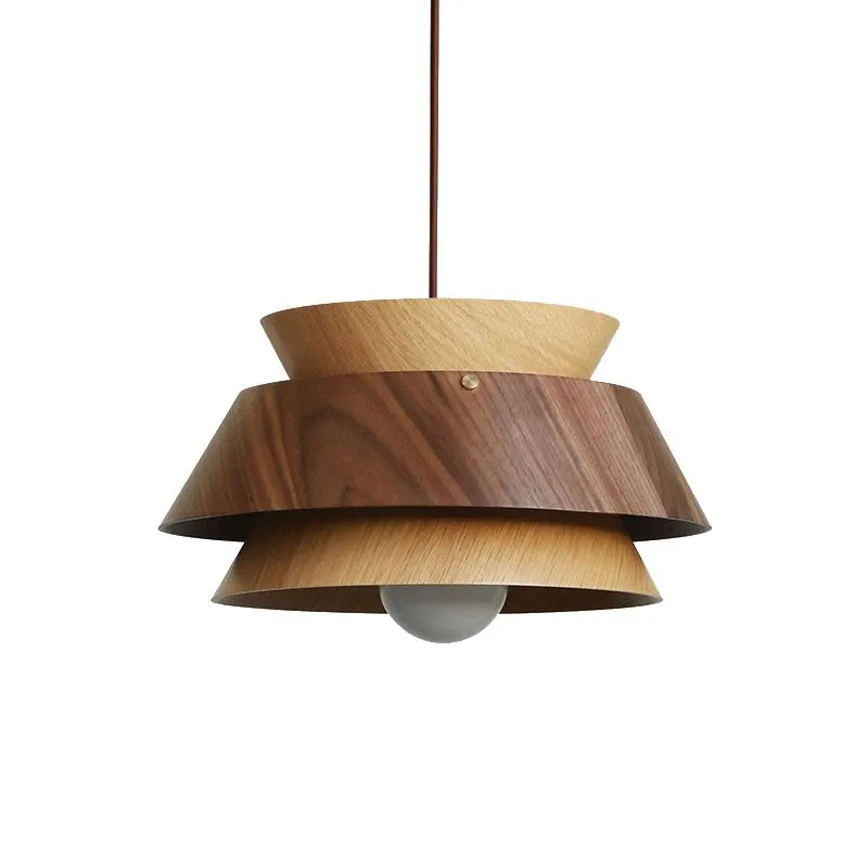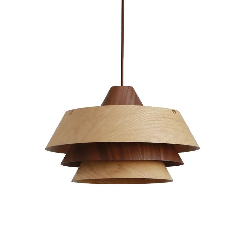 This Cascade pendant light features a series of wooden tiers, each one layered above the other in a staggered formation that resembles a stepped waterfall. The shades graduate in color from light to dark, creating a harmonious and natural gradient effect. Each tier is shaped with clean lines that suggest a modern influence, while the wood material adds a touch of warmth and organic appeal. The overall effect is one of elegant simplicity and contemporary design, with the layered shades likely to cast interesting shadows and diffuse light softly in the space it occupies. and bring both artistic design and functional lighting to the space.