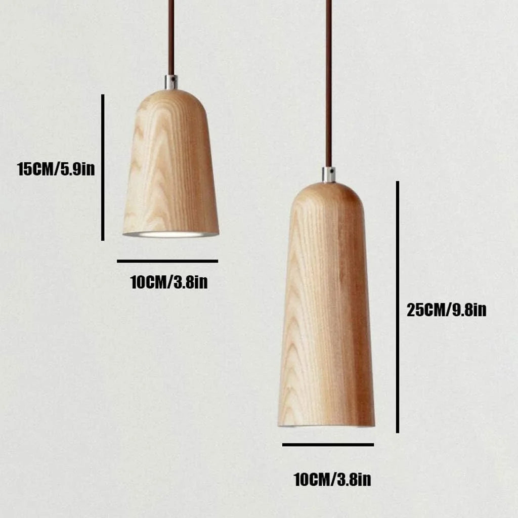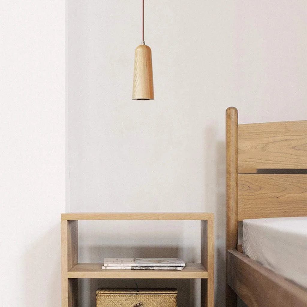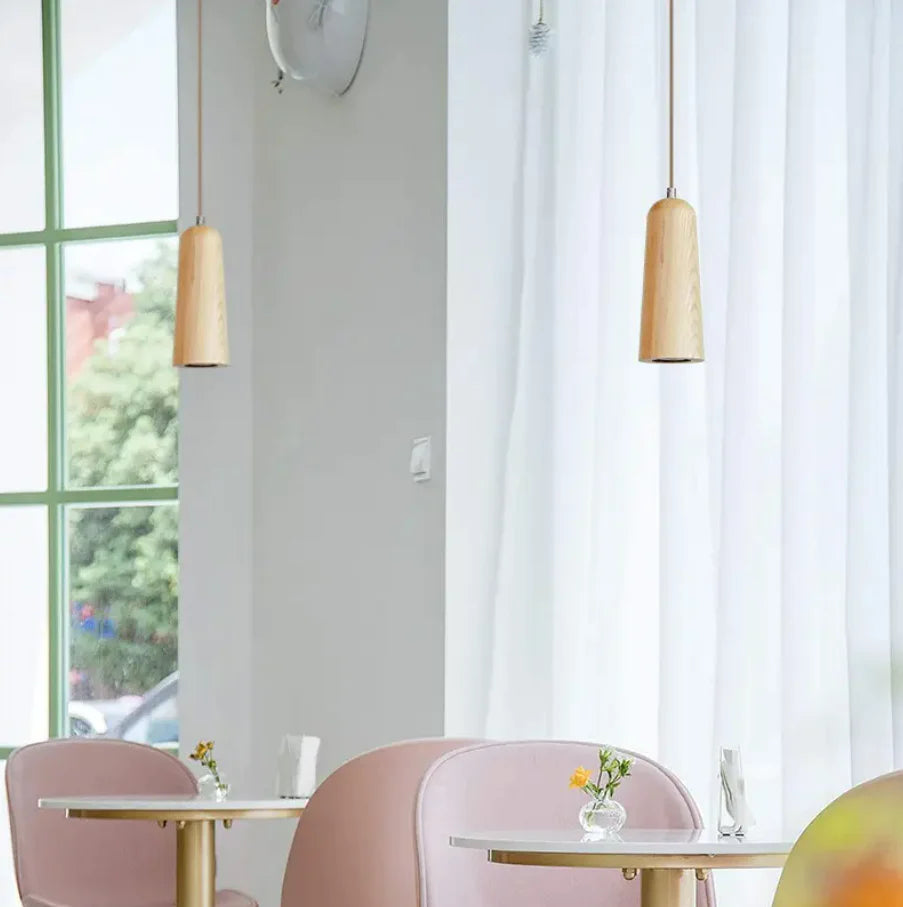 This pendant features a tall, cylindrical wooden shade, which tapers slightly towards the bottom, evoking a contemporary yet timeless design. The wood's light color and visible grain patterns lend a natural, organic feel to the lamp. The bottom of the wooden shade is open, allowing for direct downlighting. This design would fit well in a variety of settings, from a modern kitchen to a rustic-chic dining room, and is particularly suitable for areas where focused lighting is beneficial, such as over a reading nook or kitchen counter.
