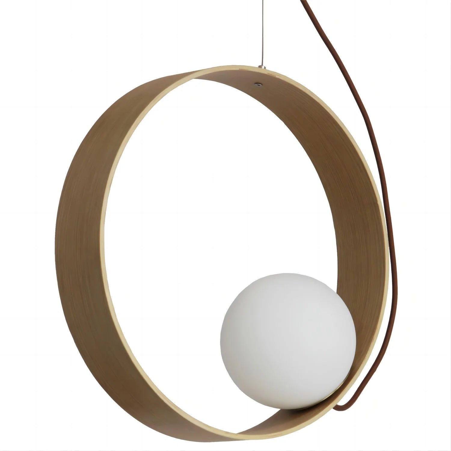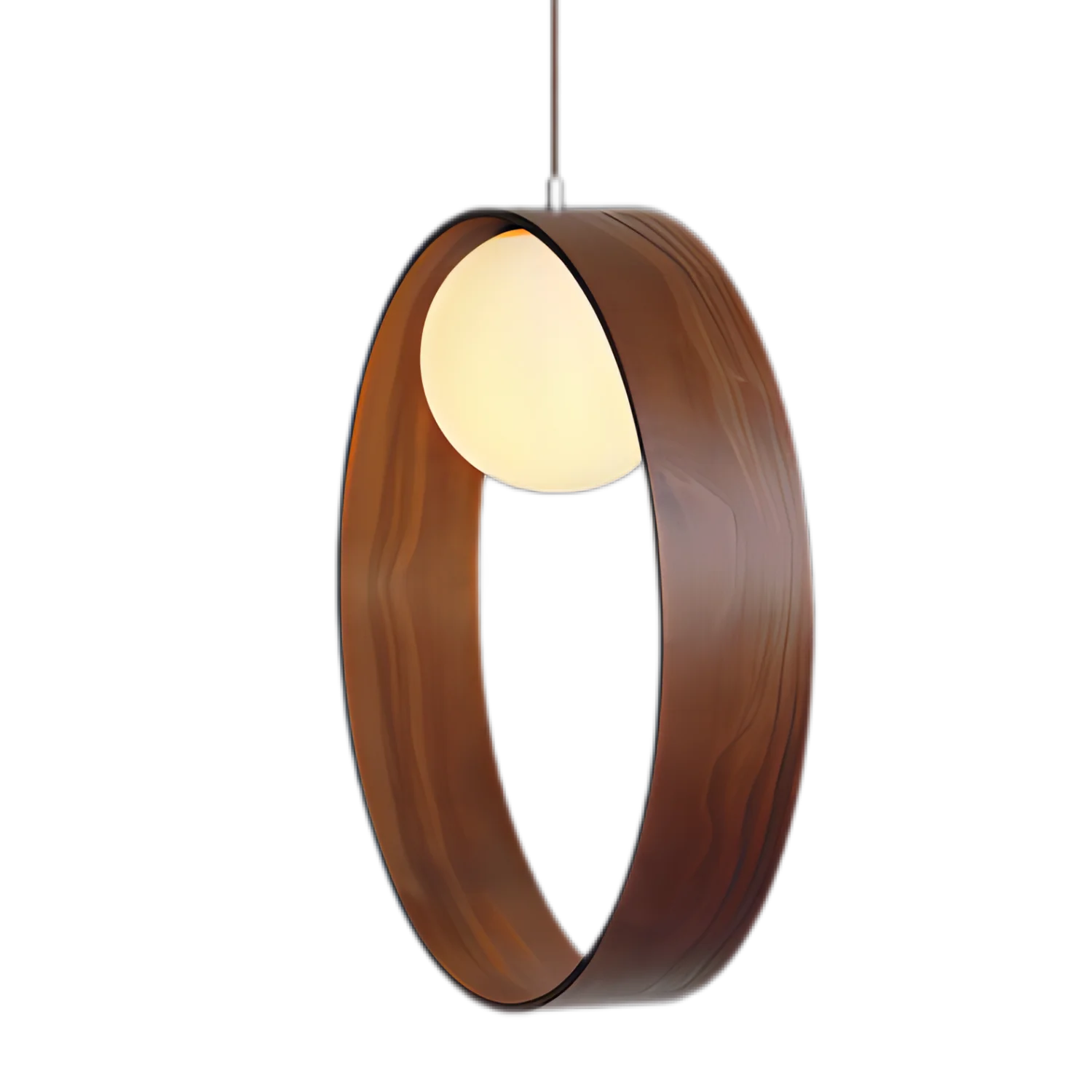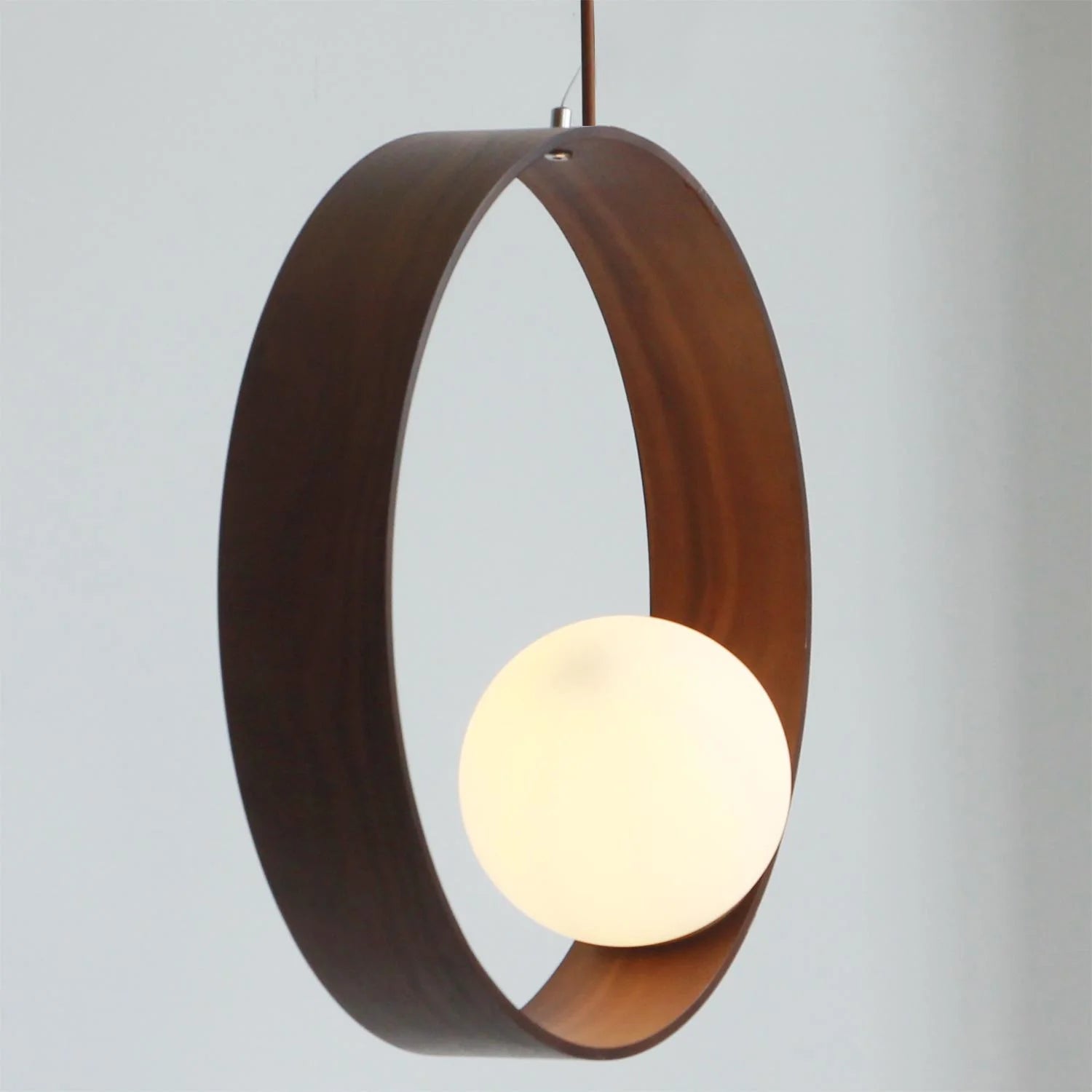 This wood pendant light features a unique, circular design. The main structure is a wide, dark wooden ring, which creates a bold and elegant loop. Within this wooden orbit, a frosted globe light is cradled, its soft luminosity contrasting with the rich, dark tones of the wood. The pendant is suspended from the ceiling by a discreet wire, enhancing the floating appearance of the ring. This design is a beautiful blend of organic and contemporary elements, giving it a sculptural quality that can complement modern interior aesthetics. It's a statement piece that would draw the eye and add warmth to a room, suitable for spaces where artful design is as appreciated as functionality.