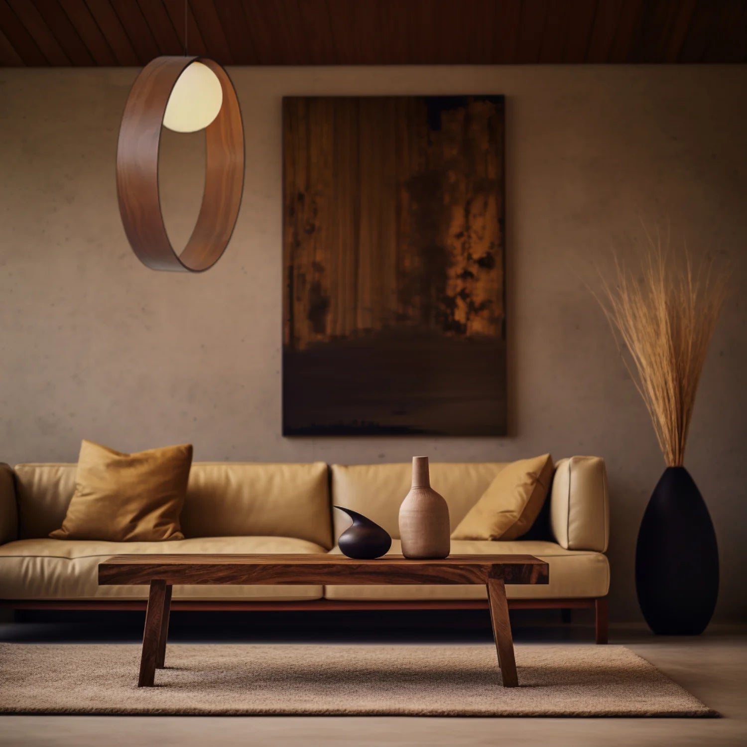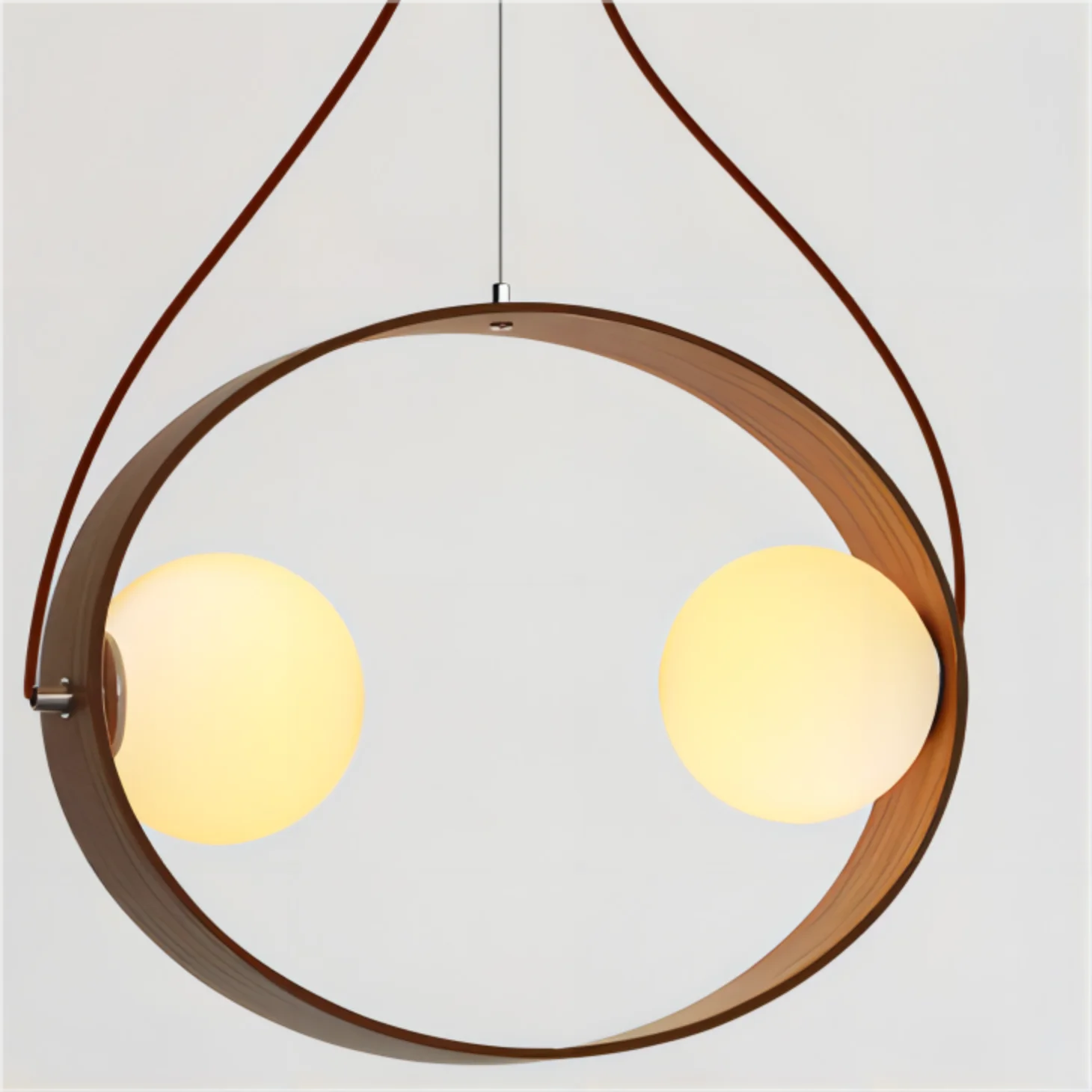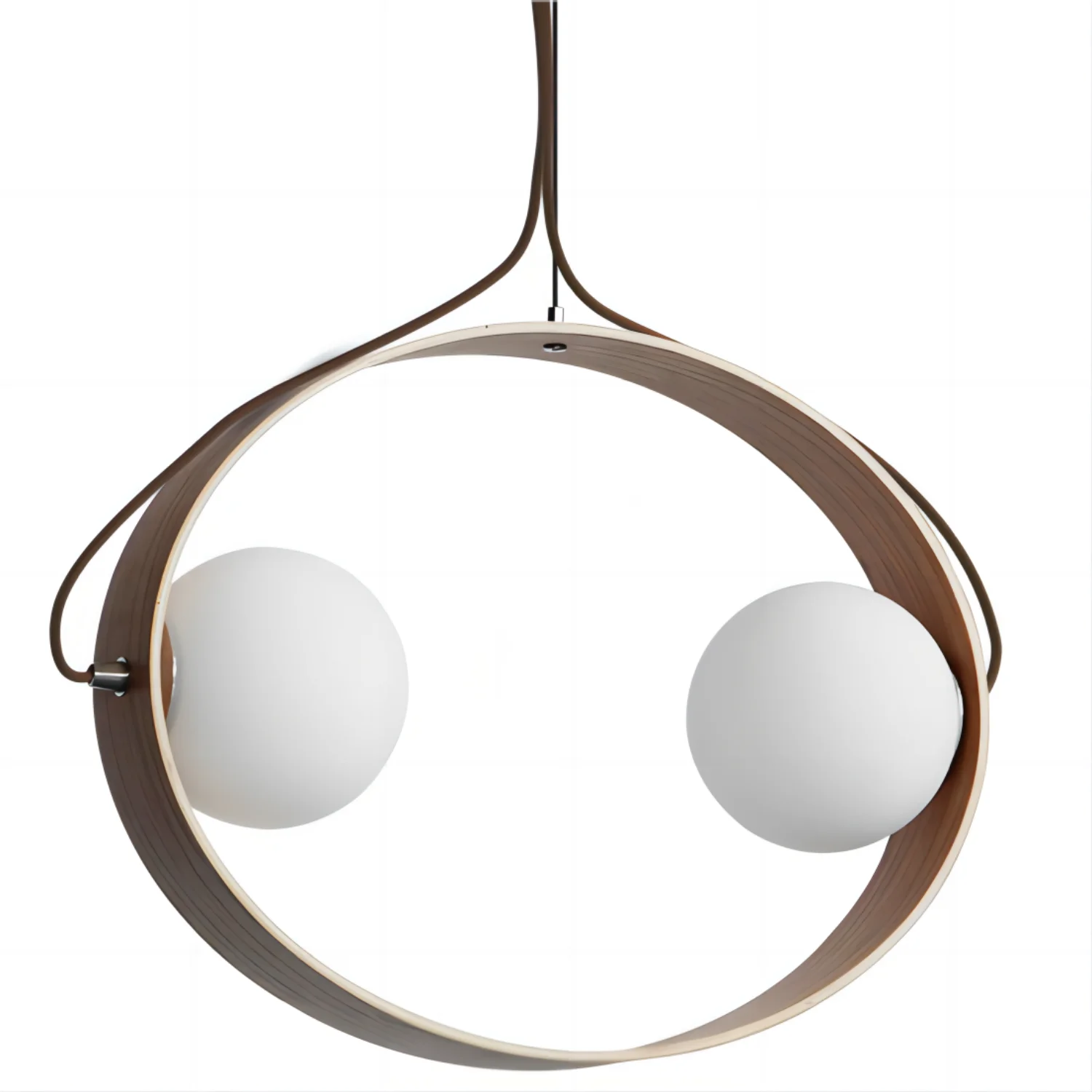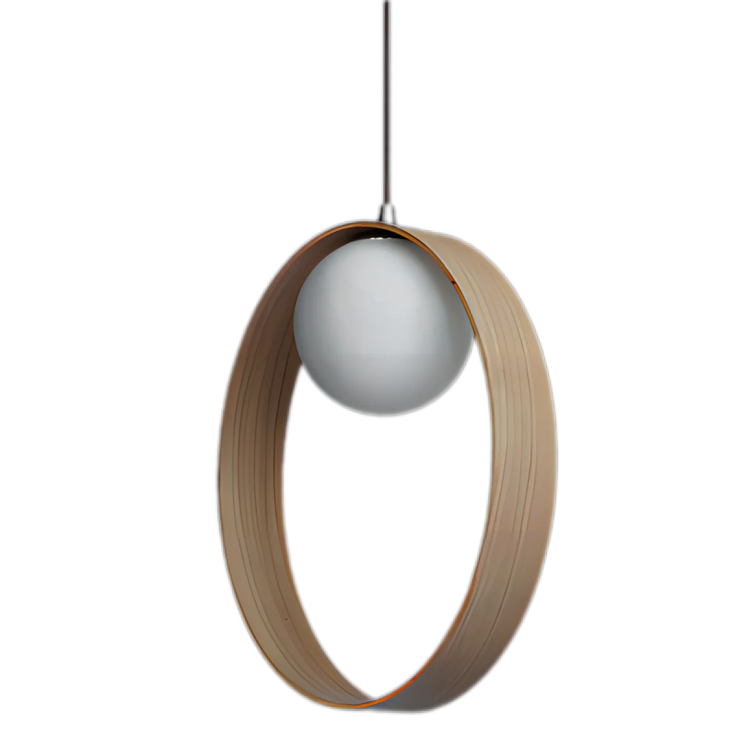 This wood pendant light features a unique, circular design. The main structure is a wide, dark wooden ring, which creates a bold and elegant loop. Within this wooden orbit, a frosted globe light is cradled, its soft luminosity contrasting with the rich, dark tones of the wood. The pendant is suspended from the ceiling by a discreet wire, enhancing the floating appearance of the ring. This design is a beautiful blend of organic and contemporary elements, giving it a sculptural quality that can complement modern interior aesthetics. It's a statement piece that would draw the eye and add warmth to a room, suitable for spaces where artful design is as appreciated as functionality.